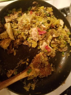 Here we did chicken, tomato, asparagus, mushrooms and some pesto but you can really do anything with it! I cook it in the oven at 400 degrees halved with a little olive oil and salt untill it looks like the skin will pull away easily! I like to then cook it in the pan with everything else because I like it overcooked! Give it a try and play around with it!